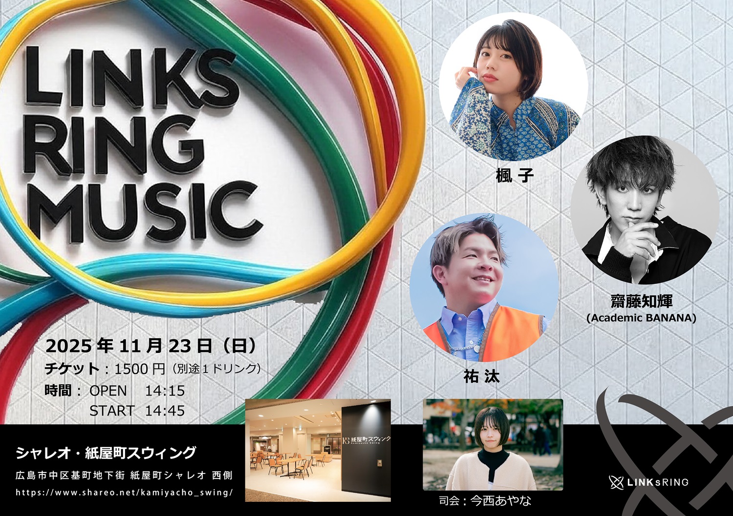| 料金 | チケット ¥1,500(別途1ドリンク) ※今までのLINKsRINGミュージックライブチケット半券をお持ちの方は500円割引で購入できます。チケット購入者の選択を「前回チケット使用」を選んでください。 ※必ず当日にチケット半券をお持ちください。チケット半券と交換となります。 ※ワンドリンク制の為、チケットとは別にドリンク500円のご注文が必要となります。 |